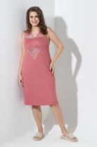 Сорочка женская полуприталенная из гладкокрашеного трикотажного вискозного полотна с отделкой кружевом, слегка расширенная книзу, без рукавов. Полочка – с V-образной горловиной и притачной кокеткой из кружева. Спинка – с двумя притачными кокетками из кружева. Горловина спинки и проймы окантованы основным материалом.