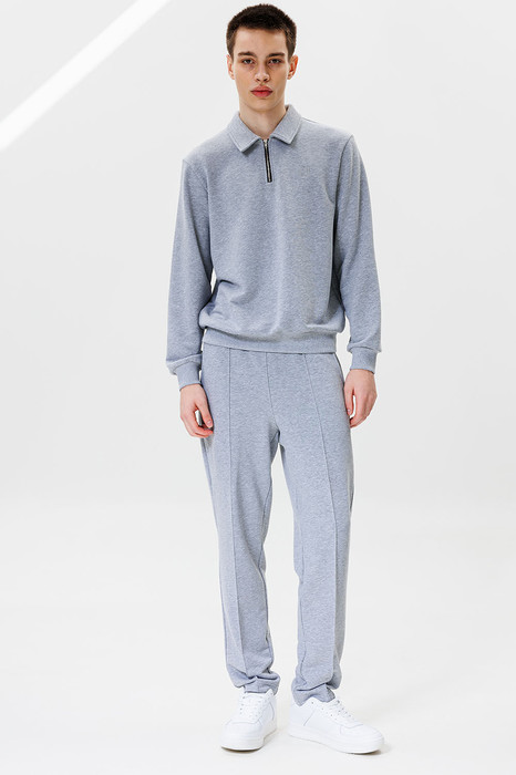 Для образа игрока в гольф не хватает воротничка! Воротник - деталь свитшота с застежкой поло, которая почекнет весь аутфит. Брюки со стрелками добавят образу строгости и деловитости, что позволит носить костюм как на прогулки, так и в офис. Пошит из комфортной ткани - футера 3-нитки без начеса.