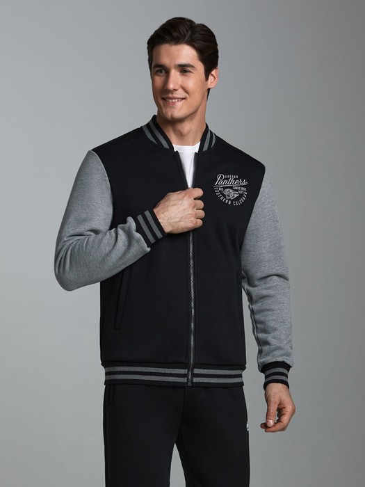 Спортивный костюм из плотного хлопкового трикотажного полотна с изнаночным начесом. Куртка на поясе с воротником, застегивается на молнию. Рукава втачные. Куртка скомбинирована из двух видов полотна, с контрастными рукавами. Яркость изделия подчеркивает клубная вышивка на груди и использование полосатого полотна для пояса, воротника и манжет куртки. Карманы куртки и брюк прорезные, с молниями . Брюки по низу заужены манжетами.Брюки прямого силуэта.Пояс брюк эластичный, по линии талии дополнительно регулируется шнурком.