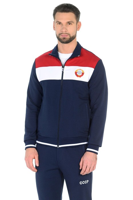 Спортивный костюм из эластичного хлопкового трикотажного полотна. Куртка на молнии с воротником-стойкой. Карманы на куртке и брюках прорезные с листочками на молнии. Посадку по фигуре обеспечивает эластичное трикотажное полотно с полосами по воротнику, поясу и манжетам. Брюки прямые. Эластичный пояс брюк по линии талии дополнительно регулируется шнуром. На левой полочке вышивка "герб СССР" шелковыми нитями, на брюках вышивка СССР. На спинке аппликация "СССР".