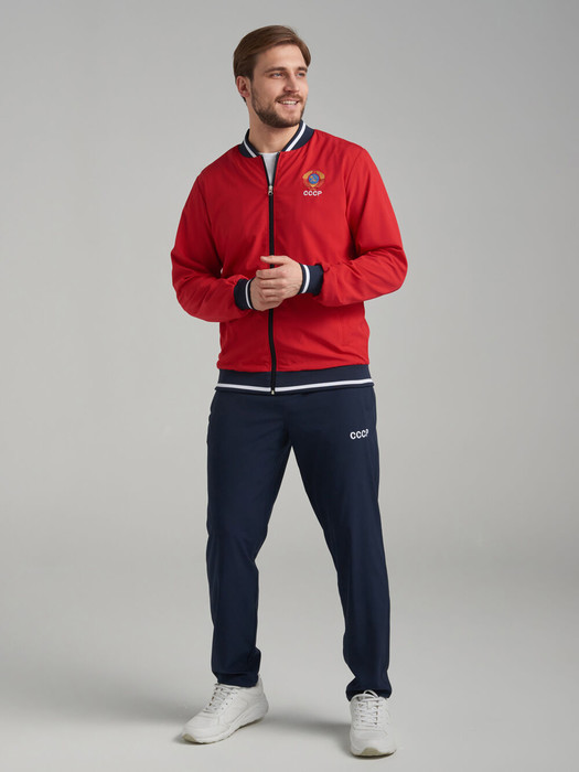 Мужской спортивный костюм изготовлен из легкой эластичной плащевой ткани. Куртка на молнии прямого силуэта на трикотажном поясе, с воротником-стойкой, на сетчатой подкладке. Рукава втачные, с трикотажными манжетами. Эластичное трикотажное полотно воротника, пояса и манжет с красной и белой полосами. Слева на груди куртки вышивка герба СССР. На спине куртки - вышивка аппликация СССР. Все вышивки выполены шелковыми нитями. Карманы куртки застегиваются на молнии. Брюки прямого силуэта, без подкладки. Спереди на брюках прорезные карманы так же застегиваются на молнию. Под левым карманом вышит логотип СССР. Пояс брюк выполнен с широкой эластичной резиной, по талии пояс дополнительно регулируется шнуром.
