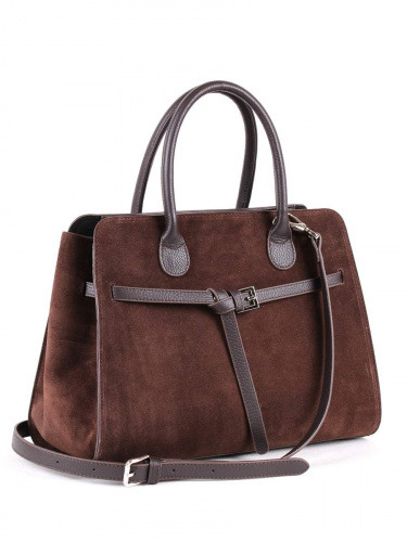 Сумка женская из натуральной замши с отделкой из натуральной кожи. Закрывается на молнию. Передняя стенка декорирована изящным ремешком. Внутри - открытый карман. Две ручки высотой 13 см. Съемный регулируемый ремень.