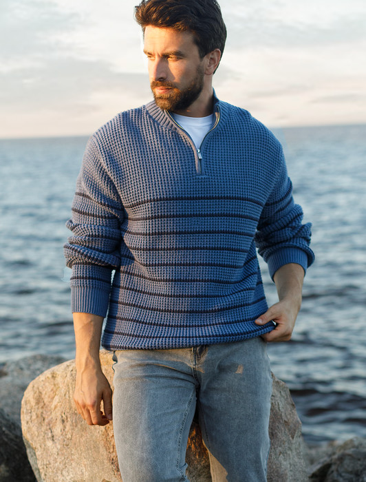 Состав: 60%Хлопок 40%ПАН (акрил) Параметры модели на первом фото: Рост 190, бюст 108, талия 87, бедра 104Свитер с узором полосы выполнен из хлопковой пряжи с добавлением акрила. Теплая модель фактурной крупной вязки с воротом, застегивается металлической молнией. Регулируя ворот можно носить с рубашками, футболками и водолазками. Кроме того, свитер совершенно не колется, поэтому его комфортно носить даже на голое тело. Внизу изделия нашивка бренда из эко-кожи.