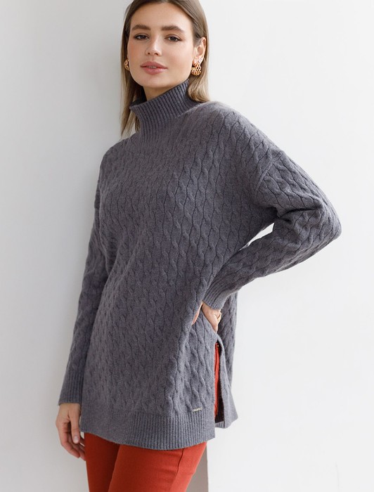Состав: 52%ПАН (акрил) 33%ПЭ 8%ПУ 7%Кашемир Параметры модели на первом фото: Рост 170, бюст 89, талия 63, бедра 92Свитер фактурной вязки косы выполнен из мягкой пряжи с кашемиром. Удлиненная свободная модель впишется в любой гардероб и поможет создать стильные расслабленные образы для любой фигуры. Нежная пряжа приятно ощущается на теле. Отдельным украшением служит металлический логотип бренда.
