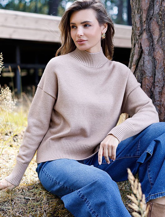 Состав: 52%ПАН (акрил) 33%ПЭ 8%ПУ 7%Кашемир Плотность: 7 GG Размер товара на первом фото: 42Свитер нейтрального цвета мокиато - сочетание бежевого и коричневого, с высоким воротом связан из высококачественной пряжи с кашемиром — идеальное сочетание мягкости и практичности. Пряжа с кашемиром придаёт ему бархатистую нежность и тонкую структуру, каждое прикосновение с которой, напоминает о тепле и уюте в прохладные дни. Благодаря нежной текстуре материала этот вариант отлично подходит даже для чувствительной кожи, не вызывая раздражения и дискомфорта в течение дня. Спущенная иния плеча придает свитеру расслабленный вид, подчеркивая актуальный стильный образ обладательницы. Универсальный крой и длина подходит для разных типов фигуры, в том числе и на большие размеры, свободный фасон не стесняет движений, а оверсайз силуэт актуален в этом сезоне и выглядит современно. Длинный рукав с широкими манжетами защищает от холода, делая этот вариант особенно практичным в осенне-зимний период. Такой теплый свитер станет надежным спутником в межсезонье и зимние дни, сочетая практичность, комфорт и стиль. Сочетается в костюме с брюками D38.013, D38.012 и юбкой D36.016