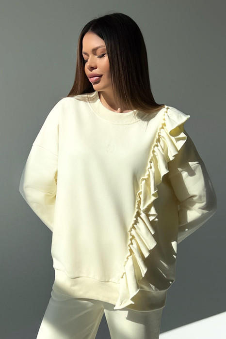 Современный, женственный свитшот, покроя oversize из комфортной ткани (футера пенье). Волан с необработанным краем (укреплён строчкой для надежности) пришит асимметрично на левой стороне изделия. Свитшот имеет спущенную линию плеча, прямой силуэт и притачную манжету по низу изделия. По центру переда вышивка – логотип в цвет ткани. Рукава с притачной по низу манжетой. Бейка горловины, низ изделия и манжеты рукавов выполнены из ткани - компаньона кошкорсе.