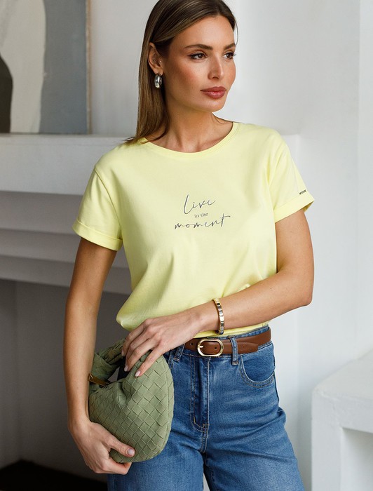 Состав: 92%Хлопок 8%ПУ Плотность: 170 Г/м2Модная футболка лимонного цвета привлекает внимание своим интересным дизайном и ярким принтом. Благодаря прямому крою изделие комфортно садится на любую фигуру, в том числе на большие размеры, и не сковывает движений. Круглый вырез подчеркивает современный стиль, а натуральный материал из хлопка с добавлением эластана обеспечивает удобство в повседневной носке и приятные тактильные ощущения. Прочность и износостойкая структура сохраняет первоначальную форму футболки после множества стирок. Рукава имеют аккуратные подгибы, что придает изделию завершенность и помогает сохранять аккуратный внешний вид. Принт надписи нанесен красками с устойчивым покрытием, перевод надписи: Live in the moment - Жить в данный момент. Стильная футболка гармонично вписывается в любой гардероб и подойдет для прогулок, отдыха дома или неформальных встреч. Благодаря особенностям кроя модель хорошо сидит, скрывая недостатки и подчеркивая достоинства. Удобная футболка идеально сочетается с базовыми вещами, позволяя создавать новые интересные образы каждый день.