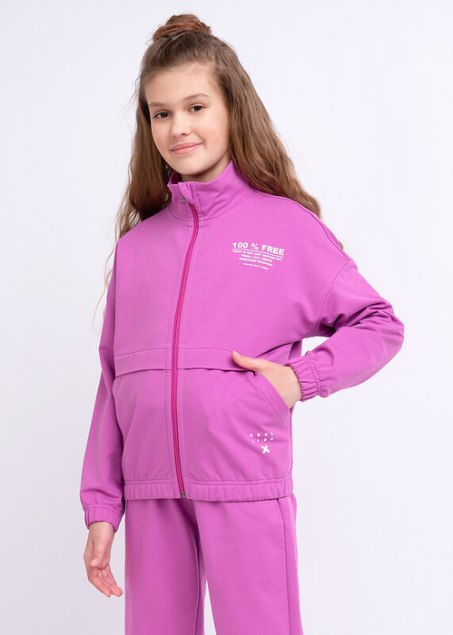 Толстовка со стойкой из эластичного футера. Для удобства застежка на молнии. Спереди карман "кенгуру" с актуальной деталью внахлест. Рукава и низ на эластичной манжете. Принт украшает переднюю часть изделия.