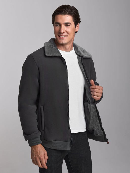 Толстовка мужская в стилистике летной куртки изготовлена из плотного флиса, дублированного мехом. Застегивается на молнию. Воротник отложной, отделан внутренним мехом. Низ куртки заужен трикотажным поясом. Рукава втачные, низы рукавов на трикотажном манжете. Карманы прорезные, с молниями На левом рукаве шеврон с фирменным логотипом.