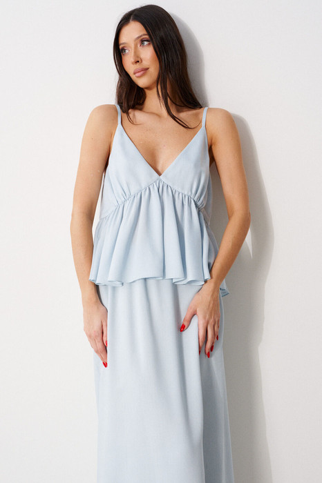 Топ свободного кроя с акцентным лифом, выполнен из мягкой струящейся ткани голубого цвета. Характеристика: V-образный вырез декольте, на регулируемых бретелях, лиф двойной, с фигурным отрезом, спинка закрытая. Длина по боковому шву (с учётом лифа) 33 см.