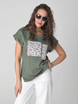 Стильная блуза из мягкой вискозы  прямого силуэта с короткими цельнокроеными рукавами подходит для девушек и женщин разных возрастных групп. Оригинальная аппликация из принтованного льна и разноуровневая линия низа с декоративными разрезами акцентируют модный стиль блузки. Она хорошо сочетается со всеми брюками, жакетами и рубашками из нашей летней коллекции.  Выбирайте понравившийся цвет, подбирайте  обувь и аксессуары, и  эта блуза  выручит Вас летним днем в городе, на прогулке и на отдыхе. Собирайте свои образы, дополняйте их яркими аксессуарами и наслаждайтесь комфортом в летние дни!