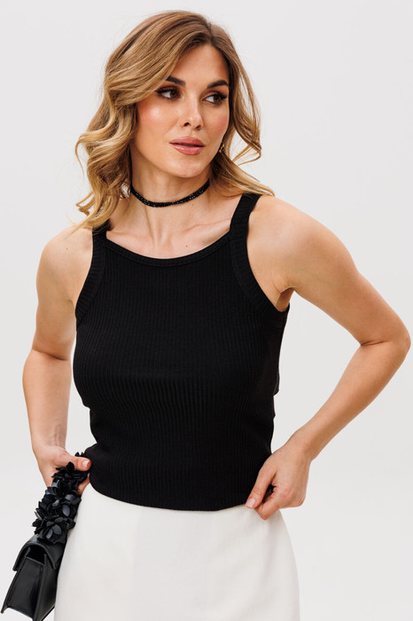 Топ выполнен из трикотажа в рубчик. Топ приталенный, длиной выше линии бедер. Перед и спинка цельные. Горловина переда и спинки окантованы.