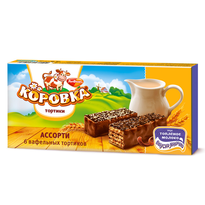 Ассорти тортиков «Коровка» от фабрики «Рот Фронт» – 6 мини-тортиков из хрустящих воздушных вафель, прослоенных ароматной молочной начинкой. Каждый покрыт нежной шоколадной глазурью и украшен двумя видами посыпки из светлой и темной шоколадной крошки. Нежное воздушное угощение с насыщенным сливочным ароматом и ярким вкусом.