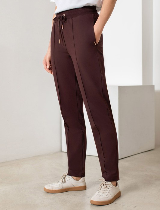 Состав: 95%Хлопок 5%ПУ Плотность: 240 Г/м2 Параметры модели на первом фото: Рост 172, бюст 88, талия 64, бедра 88 Размер товара на первом фото: 42Брюки коричневого цвета зауженного кроя выполнены из премиального футера-двухнитки. Лаконичный силуэт поддерживают застроченные стрелки, зрительно вытягивающие силуэт. Удобный пояс на резинке регулируется хлопковым шнурком с золотистой фурнитурой. Наличие эластана в составе изделия гарантирует комфорт и долговечность изделия. Эластичный материал хорошо пропускает воздух, позволяя телу дышать, и легко тянется, не ограничивая движения.