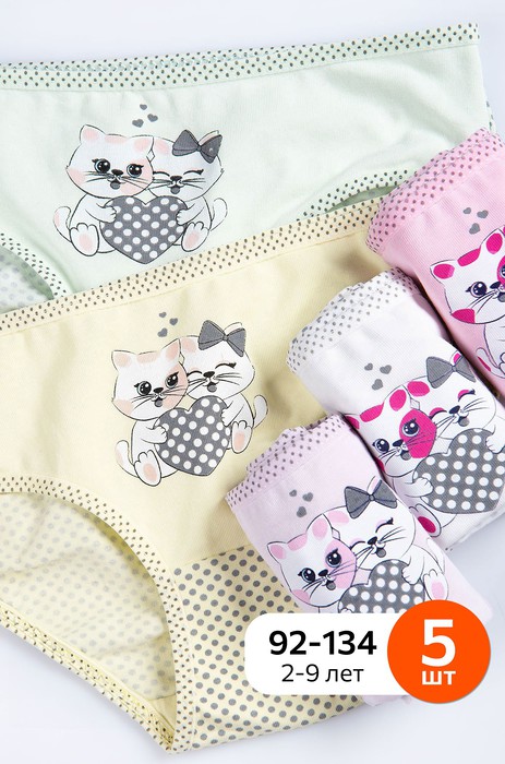 Мягкие, легкие и удобные! Набор детских трусов слипов 5 штук для девочек выполнен из приятного к телу хлопка. Базовые трусы для детей представлены в пастельных цветах и украшены милым принтом котята с сердечком.