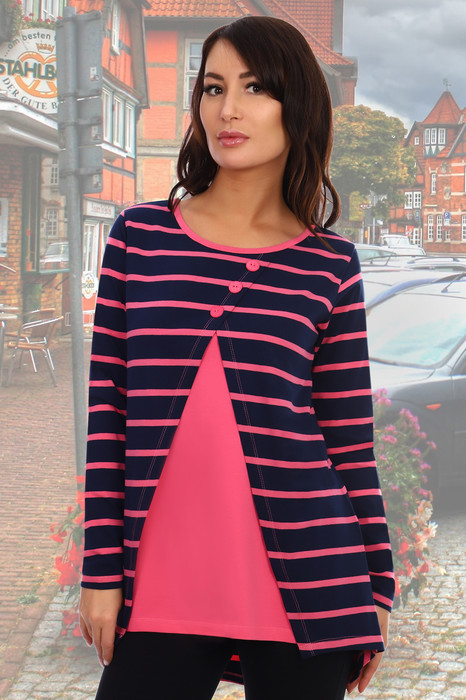Полосатая туника из кулирки с лайкрой пенье. Дизайн в виде тонких цветных полосок, однотонная треугольная вставка, декоративные пуговицы, рукава до запястий, длина чуть увеличена сзади, две расцветки — розовая и синяя