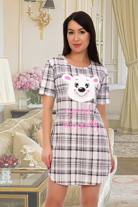 Туника из кулирного полотна, прямой силуэт, горловина круглая, рукав короткий втачной, низ изделия фигурный, обработан на плоскошовной машине, на полочке принт.