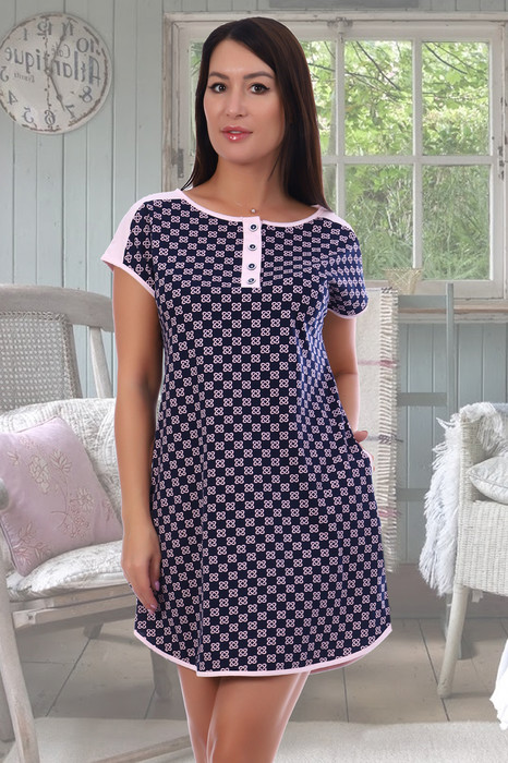 Туника женская выполнена из кулирки 100% хлопок.  Свободного кроя, горловина, рукава и низ изделия окантованы контрастным цветом. На передней полочке планка на 4-х функциональных пуговицах.