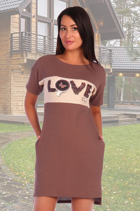 Туника с принтом полуприталенного силуэта, из комбинированного, приятного к телу, трикотажа " Соты". Горловина в виде лодочки, обработана обтачкой. Спущенная пройма, короткий рукав, в боковых швах удобные карманы.Низ спинки удлинён, по бокам небольшие разрезы.