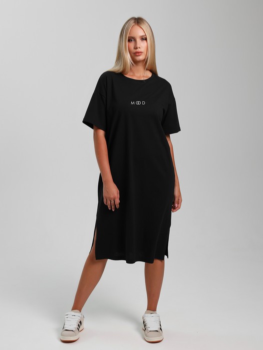 Туника молодежная из гладкокрашенного полотна «кулирка», свободного покроя, с короткими втачными рукавами, горловиной овальной формы, обработанной притачной бейкой и разрезами в боковых швах. На полочке выполнен принт в технике «шелкографии».