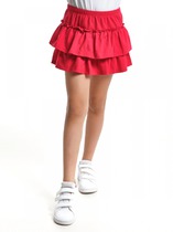 Трикотажная юбка А-силуэта, декорированная бахромой из шифона. Талия на резинке с люрексом.На ребенке представлен размер 140:- Ширина изделия по линии талии 28,2 см- Ширина по низу изделия 45,5 см- Длина изделия 35 смРазница между размерами составляет 1,5 см.