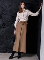 Трикотажная юбка из устойчивого полотна «джерси». Юбка-карандаш, заужена к низу. По асимметричный низ подчеркнут вышивкой «решелье» в виде стилизованного цветка с небольшими просветами вырезанных элементов вышивки.