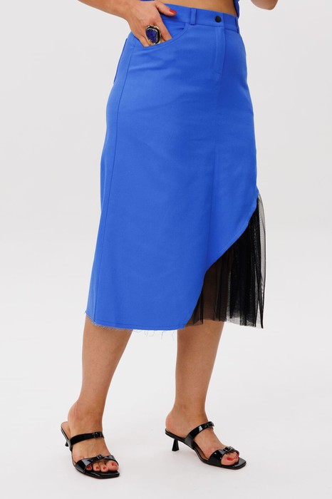 Эта юбка «дельфиниум» в изысканном силуэте трапеции, мягко ниспадающая до колена, воплощает в себе гармонию элегантности и современного стиля. Ее лаконичный крой подчеркивает женственность, а декоративная вставка из воздушной сетки придает образу ноту загадочности и утонченности.