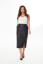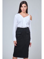 Юбка прямая, зауженная книзу, длиной миди, с высокой посадкой, с поясом из эластичной тесьмы. На переднем полотнище разрез в вертикальном шве.