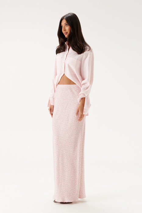 Юбка полуприлегающего силуэта выполнена из струящегося полотна розового цвета в мелкий цветочек. Характеристики: полуприлегающий силуэт, пояс на резинке. Длина по боковому шву 110 см.
