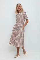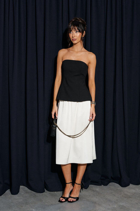 Юбка полуприлегающего силуэта выполнена из струящегося полотна молочного цвета на подкладке. Характеристики: полуприлегающий силуэт, пояс на резинке. Длина по боковому шву 77 см.
