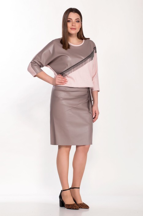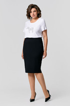 Юбка женская прилегающего силуэта выполнена из экокожи, спереди в рельефе выполнены горизонтальные складки, украшены декоративными хлястиками. Длина юбки 60 см.
