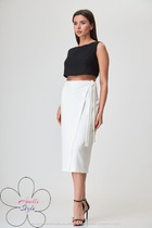 Юбка прямого силуэта из атласа и кружева. Юбка на обтачке. По переднему и заднему полотнищам юбки - вытачки. Юбка с застежкой в боковом шве на потайную тесьму-молнию. Верхняя часть юбки из атласа с асимметричный краем, нижняя часть юбки из кружева с ажурным низом. Юбка без подкладки.