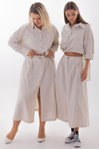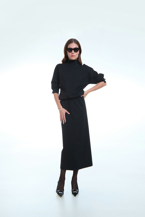 Юбка женская, длиной ниже колена из трикотажного полотна. В нижней части левого бокового шва разрез. Пояс на резинке.