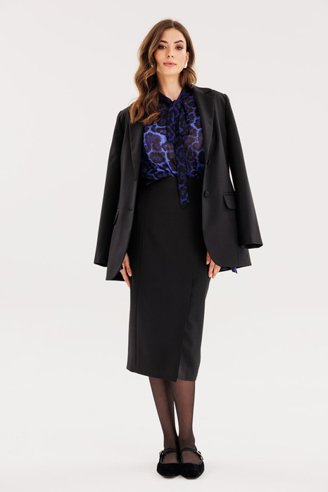 Юбка выполнена из однотонной костюмной ткани. Юбка на подкладке, заужена к низу. Юбка на широком поясе с широкими шлевками, застежка сзади в среднем шве, по переду вертикальные декоративные карманы с листочкой, в рельефе спереди шлица с имитацией застежки в запах.