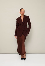 Юбка выполнена из плотного атласа. Юбка расширенная к низу, на притачном поясе, длиной миди.Переднее и заднее полотнища цельные и выкроены по косой. Застежка в левом боковом шве на потайную молнию и пуговицу. Юбка без подкладки.