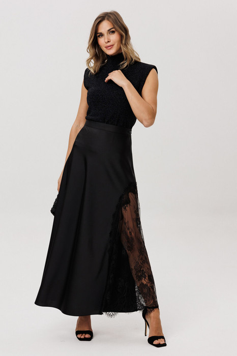 Юбка выполнена из плотного атласа. Юбка А-образного силуэта, на притачном поясе, длиной 7/8. Юбка выкроена по косой. Застежка в левом боковом шве на потайную молнию и пуговицу. По левому боку декоративная вставка из гипюра с фестонами.