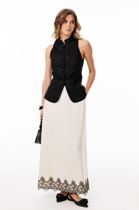 Юбка выполнена из льна. Юбка А-образного силуэта, длиной до линии щиколотки, на притачном поясе. На переднем полотнище обработаны боковые карманы с наклонным входом. На заднем полотнище обработаны талиевые вытачки и средний шов с застежкой на потайную молнию. Пояс застегивается на пуговицу. Юбка декорирована по низу настрочным кружевом. Юбка без подкладки.