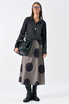 Юбка-карандаш женская из искусственной кожи. Длина юбки до середины икры. По переду в юбке обработаны карманы с отрезным бочком, по концам кармана установлены хольнитены. Перед юбки с центральным швом, в котором обработан гульфик с застежкой – молнией. Спинка юбки со средним швом в котором располагается разрез. Верх спинки юбки с отрезной фигурной кокеткой и вытачками. Верхний срез юбки обработан отрезным поясом, с резинкой по спинке и шлевками. Пояс застегивается на кнопку.