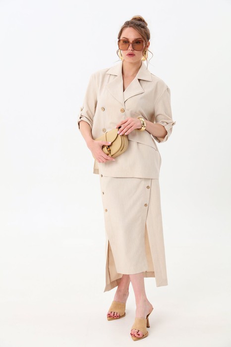 Юбка длиной миди, расклешенная к низу, с асимметричным низом. Пояс притачной, по спинке собран на резинку. Переднее полотнище состоит из трех частей. Правая часть скреплена отделочной строчкой и кнопками. В боковых швах изделия расположены карманы. По спинке изделия идёт средний шов и две вытачки для удачной посадки по фигуре. Юбка без подкладки.