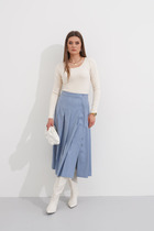 Стильная юбка женственной формы из хлопка, перед которой декорирован дизайнерской вышивкой. По переду и спинке юбки пояс кокетка со шлевками. По переднему шву функциональная застежка на петли и пуговицы.