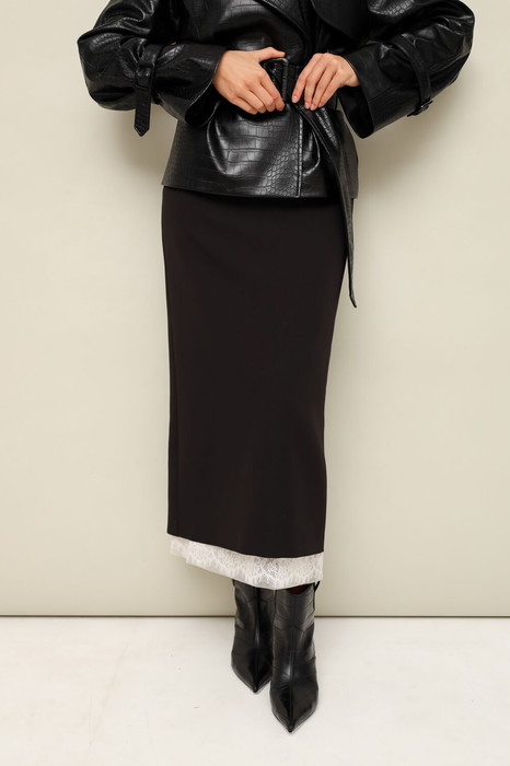 Юбка-карандаш прямого силуэта в длине миди. Верхняя юбка выполнена из костюмно-плательной ткани, пояс на обтачке, застёжка на потайную молнию в среднем шве по спинке. Нижняя юбка на резинке по поясу, низ обработан кружевной отделкой с сеткой. Для удобства движения сзади по юбкам обработаны разрезы