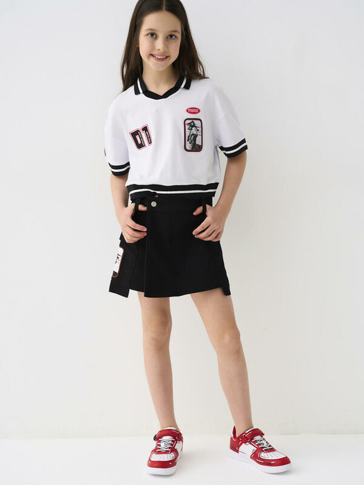 Юбка-шорты в длине мини для девочки подростка. Выполнена из плотной чёрной джинсовой ткани. Внешне выглядит как юбка с запахом, но внутри находятся удобные шорты, обеспечивающие комфорт и свободу движения. На боках расположены два объёмных накладных кармана с клапанами. Пояс выполнен с внутренней резинкой и шлёвками, застёжка — на молнию и металлическую кнопку. Сзади — декоративная силиконовая нашивка с надписью "SPEED", а спереди — яркая печать с изображением девушки на мотоцикле. Изделие оформлено отделочной строчкой и имеет современную, уличную стилистику.