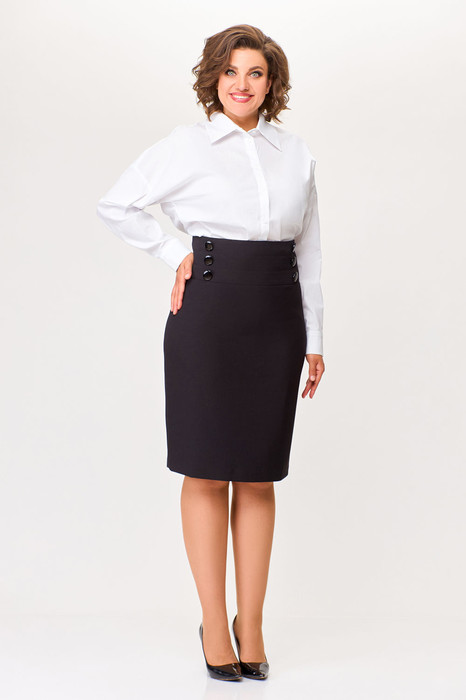 Юбка на подкладке прилегающего силуэта слегка заужена к низу, с завышенной талией. На заднем и переднем полотнище кокетка, состоящая из трех частей. Средний шов спинки с застежкой на потайную тесьму молнию и шлицей по низу. По швам стачивания кокеток задней и передней половинок юбки проложена отделочная строчка на 0,2 см по обеим сторонам шва. По линии притачивания кокетки также проложена отделочная строчка на 0,2 см. На кокетке передней половинке юбки пришиты 6 отделочных пуговиц.
