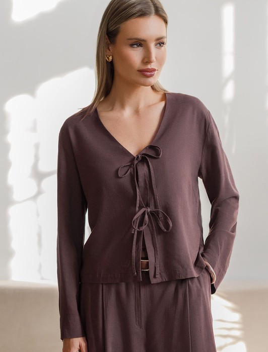 Состав: 70%Вис 30%Лен Плотность: 200 Г/м2Свободная блузка коричневого цвета с завязками изо льна с вискозой, плотностью 200 Г/м2 - идеальный вариант для весны и лета. Сочетание льна и вискозы обеспечивает комфорт и прохладу в жаркие дни. Материал хорошо драпируется и мягко прилегает к фигуре, создавая струящиеся складки. Эта эффектная блузка сочетает в себе современный крой, удобство и стиль. V-вырез визуально вытягивает силуэт, спущенная линия плеча придает модный и расслабленный акцент, а широкий рукав создает красивый и воздушный силуэт. Завязки делают льняную блузку особенно практичной, вы можете носить ее растегнутой, в качестве верхнего слоя. Эта легкая романтичная блузка подходит для повседневного гардероба, смотрится красиво и стильно, обеспечивая максимальный комфорт, подойдет и на большие размеры.