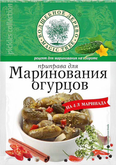 Состав: семена горчицы, укроп, хрен, чеснок, перец черный, перец душистый, лавровый лист, корица, гвоздика, перец красный, петрушка