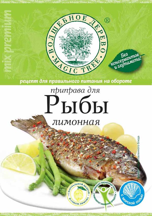 Приправа содержит ароматные травы, пряности, натуральный экстракт чеснока, лимонную цедру и сок в оригинальном сочетании для приготовления любой морской и речной рыбы.