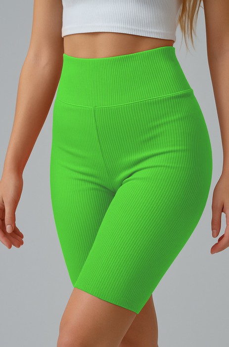Широкая эластичная резинка нежно прилегает и не сдавливает живот. Благодаря облегающему крою зеленые велосипедки в рубчик повторяют каждое движение тела.