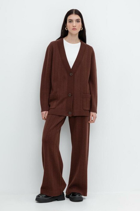 Пояс регулируется вязаным шнуром в тон брюк. Плотная фактура вязания согревает и сохраняет форму во время носки.