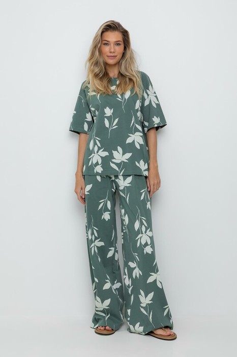 Брюки прямого свободного кроя с боковыми карманами из набивного трикотажа супрем.