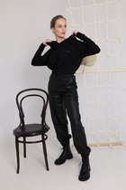 Свободные женские брюки со стрелками и боковыми карманами из плотного гладкого трикотажа интерлок. Модель с контрастными боковыми вставками и разрезами по низу. Застегиваются на молнию и кнопку. Низ обработан плоскими швами.